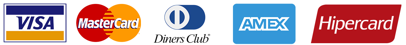 Aceitamos os cartões de crédito Visa, Mastercard, Diners, Amex e HiperCard. Nosso sistema de cobrança por cartão de crédito é 100% seguro. Os números são criptografados e não ficam armazenados em nosso banco de dados, sendo enviados diretamente para a administradora do cartão. Utilizando esta opção, você poderá realizar o pagamento à vista ou em até 3 vezes sem juros (Com parcela mínima de R$ 50,00).
